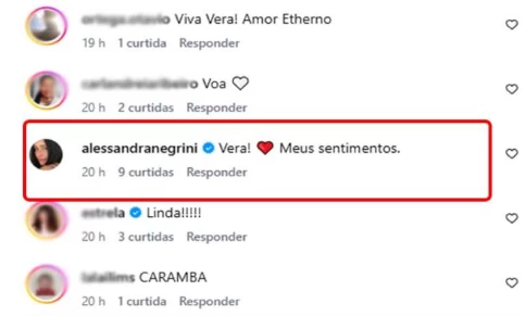Sensibilizada com a notícia, Alessandra deixou uma mensagem simples, porém carregada de afeto, nos comentários da publicação: “Vera, meus sentimentos!”. O gesto foi acompanhado por inúmeras outras manifestações de carinho e respeito.