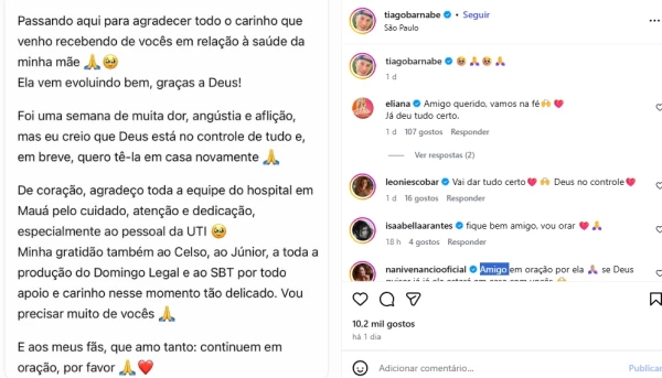 Mesmo diante da situação, Barnabé demonstrou esperança na recuperação da mãe e reforçou o pedido por orações. O caso mobilizou fãs e colegas de trabalho, que seguem enviando mensagens de apoio ao artista durante esse período delicado da vida pessoal.