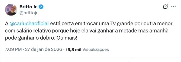 Britto Jr. comentou a troca de emissoras através de seu perfil oficial na plataforma X, antigo Twitter. O apresentador afirmou que a artista está correta ao trocar uma emissora maior por outra menor visando o crescimento futuro.