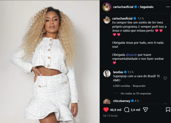 Além de manifestar sua fé, a comunicadora fez questão de exaltar uma de suas maiores influências globais ao declarar: “Obrigada, Oprah, por trazer representatividade e nos fazer sonhar”, utilizando o exemplo de Oprah Winfrey para ilustrar a importância do protagonismo negro na comunicação.