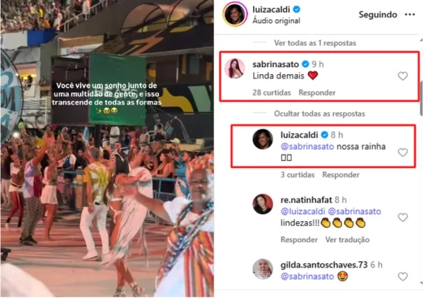 A interação nas redes sociais ganhou destaque quando Sabrina Sato elogiou Luiza Caldi com um entusiasmado: “Linda demais!”, recebendo como resposta o reconhecimento de: “Nossa rainha”. Esse diálogo público reafirma a relação respeitosa entre as duas, que compartilham a dedicação à Vila Isabel. Enquanto Sabrina se prepara para brilhar novamente à frente da bateria, a escola levará para a Sapucaí o enredo Macumbembê, Samborembá: Sonhei que um sambista sonhou a África, celebrando a obra de Heitor dos Prazeres.