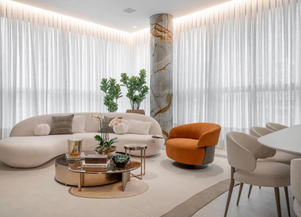 A unidade possui uma área privativa de 188 metros quadrados e oferece uma vista privilegiada para o mar do litoral catarinense. O projeto interno conta com quatro suítes completas e ambientes integrados que seguem uma linha de arquitetura contemporânea.