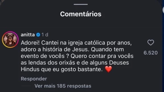 O conteúdo viralizou rapidamente e chegou ao conhecimento da própria Anitta, que decidiu se manifestar diretamente na publicação. Em sua declaração, ela escreveu: “Quero contar para vocês as lendas dos orixás e de alguns Deuses Hindus que eu gosto bastante“.