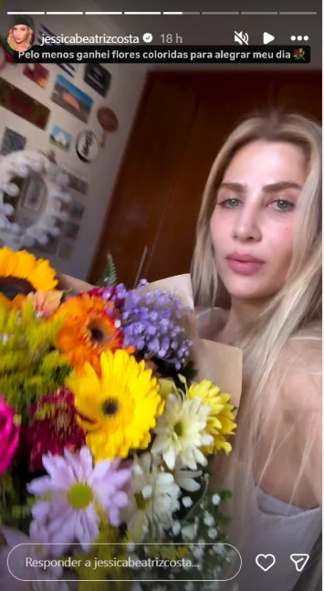 Apesar do rompimento, a influenciadora mostrou que o dia ganhou um toque de delicadeza. Antes de revelar a solteirice, ela compartilhou a foto de um mimo que recebeu: “Pelo menos ganhei flores coloridas para alegrar meu dia”, comentou ao exibir o buquê.