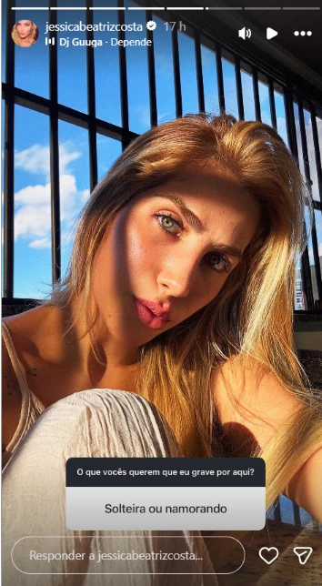 Nesta quinta-feira (5/3), Jéssica Beatriz Costa utilizou o Instagram para interagir com seus seguidores e esclarecer dúvidas sobre seu status de relacionamento. Ao ser questionada por um fã se estava solteira ou comprometida, a influenciadora de 31 anos e filha do cantor Leonardo optou por uma resposta inicial descontraída. Ela compartilhou uma selfie ao som da música Depende, hit de DJ Guuga com a participação de seu irmão Zé Felipe, cuja letra sugere que o estado civil varia de acordo com o pretendente.