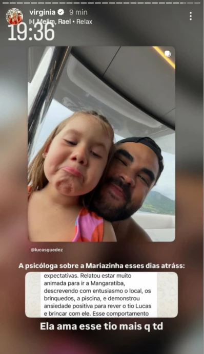 “Relatou estar muito animada para ir a Mangaratiba, descrevendo com entusiasmo o local, os brinquedos, a piscina e demonstrou ansiedade positiva para rever o tio Lucas e brincar com ele”, relatou a profissional sobre o que Maria Alice tinha falado. Ao ver que a garota queria vê-lo, Lucas Guedez chorou. “Eu encaminhei para ele a mensagem e recebi isso: bom nunca mais mando”, riu Virginia Fonseca ao ver o amigo emocionado.