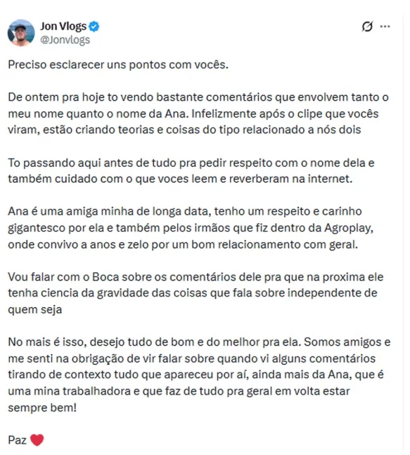 Jon explicou que se sentiu no dever de intervir ao notar que a situação estava fugindo do controle, dizendo: “Desejo tudo de bom e do melhor pra ela. Somos amigos e me senti na obrigação de vir falar sobre quando vi alguns comentários tirando de contexto tudo que apareceu por aí”. Para encerrar as especulações e reforçar sua admiração pela artista, ele acrescentou: “Ainda mais da Ana, que é uma mina trabalhadora e que faz de tudo pra geral em volta estar sempre bem!”.