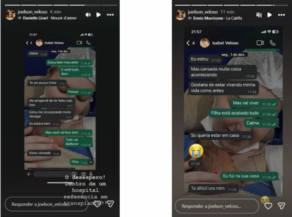 “O desespero! Dentro de um hospital referência em transplante?!“. O esgotamento psicológico de Isabel transpareceu em diversos momentos do diálogo, nos quais ela demonstrava o anseio de recuperar sua antiga realidade, pedindo orações e relatando o cansaço extremo por estar longe de casa.