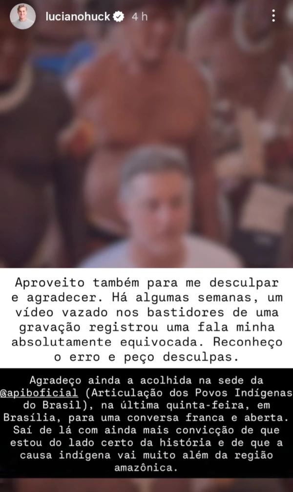 Ainda no Story do Instagram, Luciano Huck explicou que a fala registrada foi absolutamente equivocada e reforçou que assume a responsabilidade pelo ocorrido. O apresentador também destacou que esteve recentemente na sede da Articulação dos Povos Indígenas do Brasil (Apib), em Brasília, onde participou de uma conversa aberta sobre o assunto.