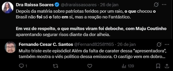 O episódio noticiado envolveu um raio que atingiu um grupo de manifestantes em Brasília (DF), deixando dezenas de pessoas feridas. A controvérsia, no entanto, não se concentrou no conteúdo da reportagem exibida no domingo (25), mas na reação de Maju logo após o encerramento do vídeo. Ao retornar ao estúdio ao lado de Poliana Abritta, a apresentadora apareceu sorrindo antes de anunciar a pauta seguinte do programa.
