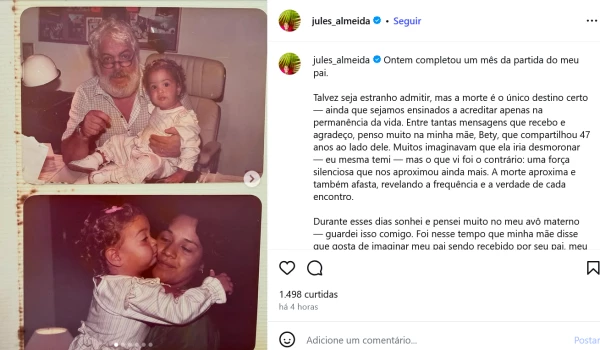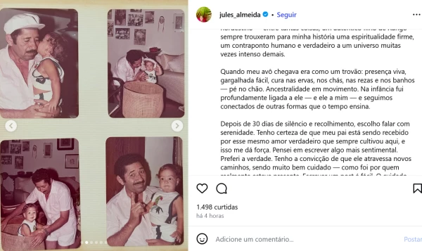 A postagem também trouxe detalhes sobre a história da família e a influência do avô materno de Júlia na formação de sua espiritualidade. Ela revelou ter sonhado com o antepassado e descreveu a herança cultural boliviana e nordestina que compõe sua base pessoal.